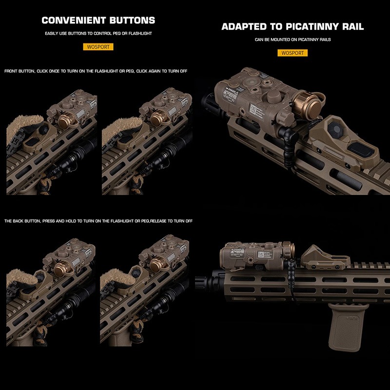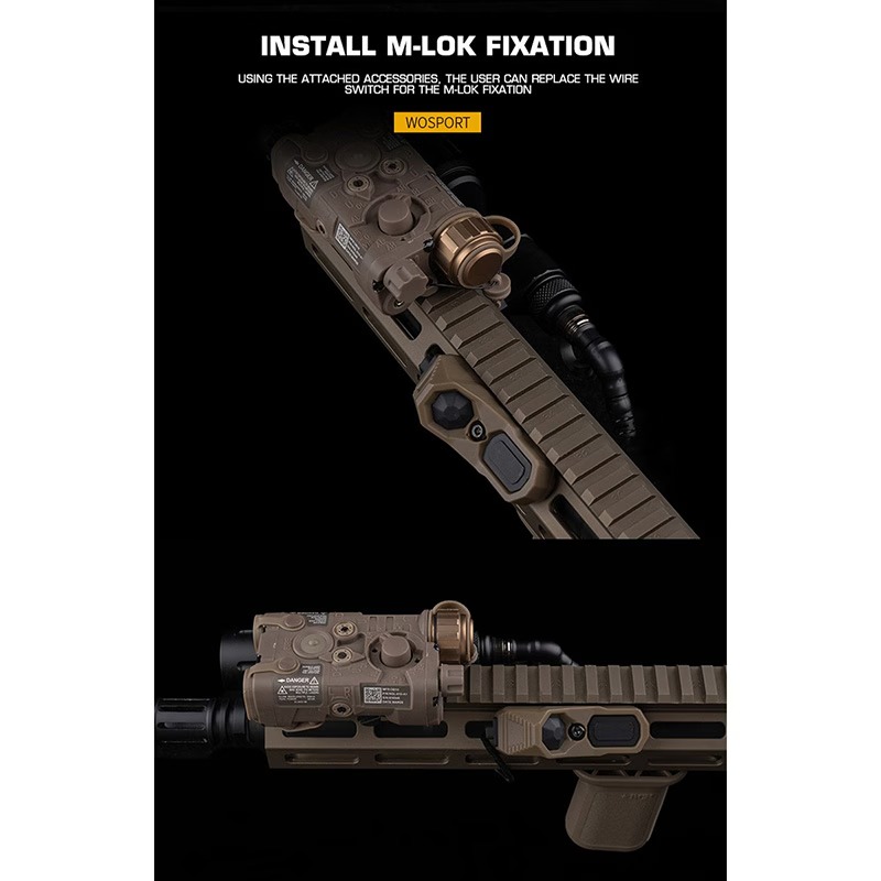 前方ボタンはクリック式、後方はホールド式として設計されており、フラッシュライトやレーザーの素早い操作に最適。