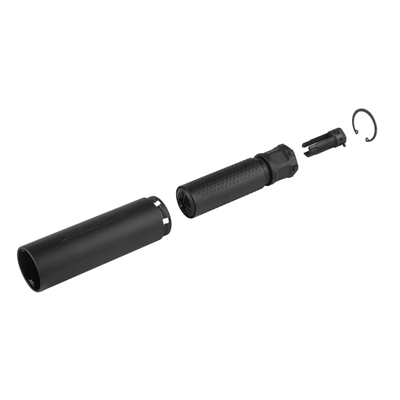 アルミ合金製のサプレッサー本体とシュラウド、そしてスチール製のQDハイダーで構成されており、ハイダーを取り付けた状態でサプレッサーをかぶせ、実物同様スナップリングを締め込み固定できる仕組みになっています。