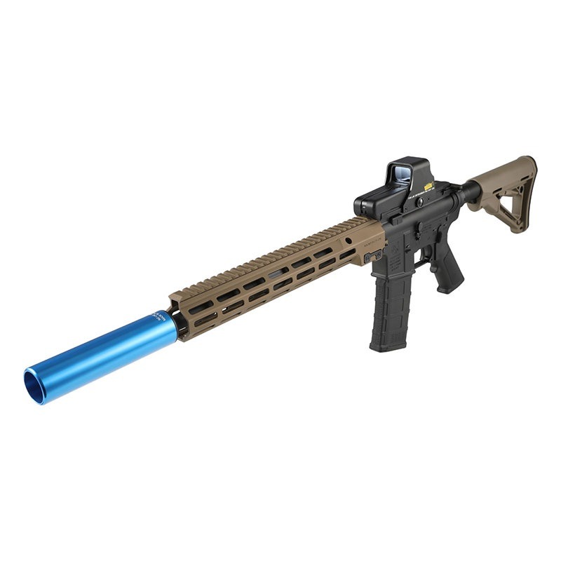 訓練用弾薬であるシムニッションと共にダミーサプレッサーとして使用されるBlue Canタイプのレプリカサプレッサー。